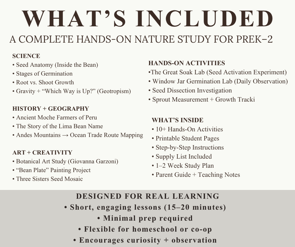 A hands-on seed study for ages 4–8 exploring germination, plant growth, and real-life science through observation, simple experiments, and garden-based learning.
