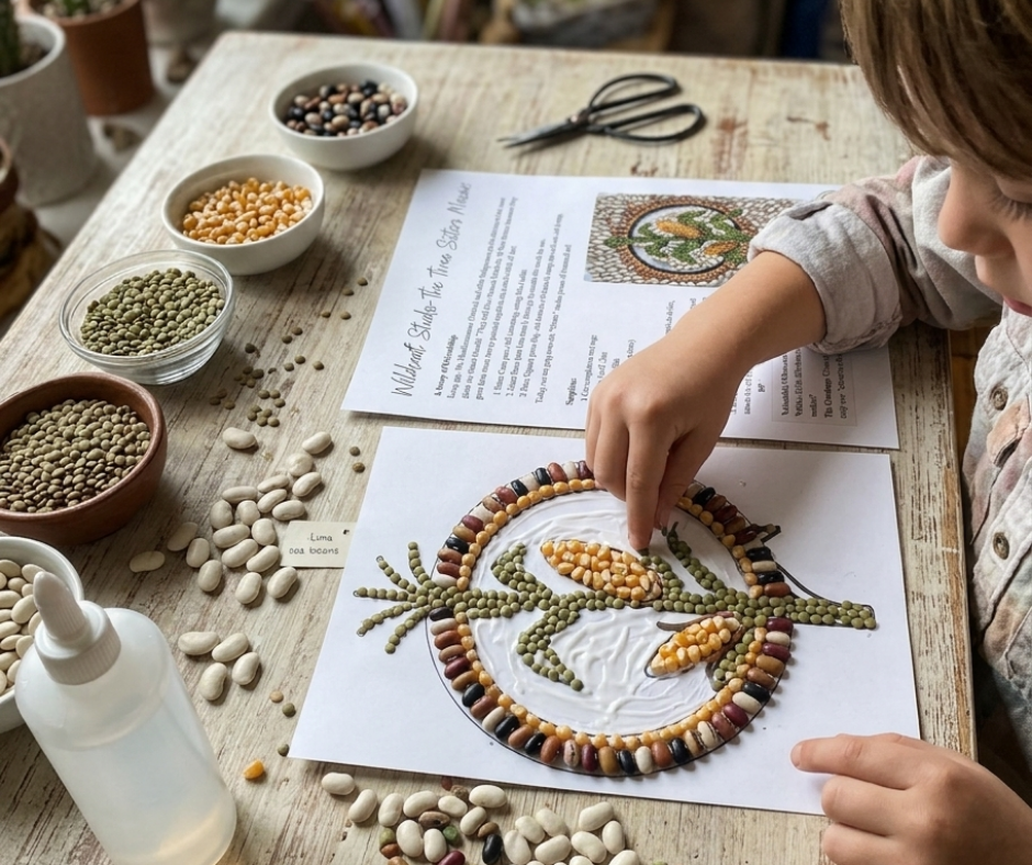 • A textured “Three Sisters” mosaic using real seeds
