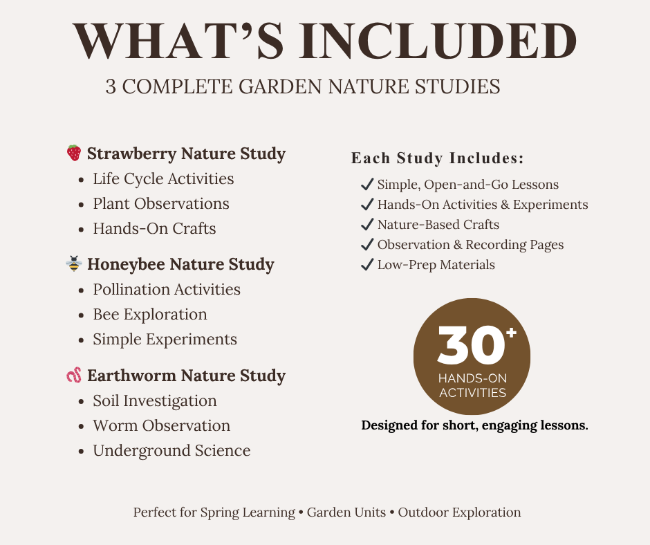 The Spring Garden Science Bundle invites your child into the rhythms of the garden, where plants grow, bees pollinate, and earthworms quietly shape the soil beneath our feet.
